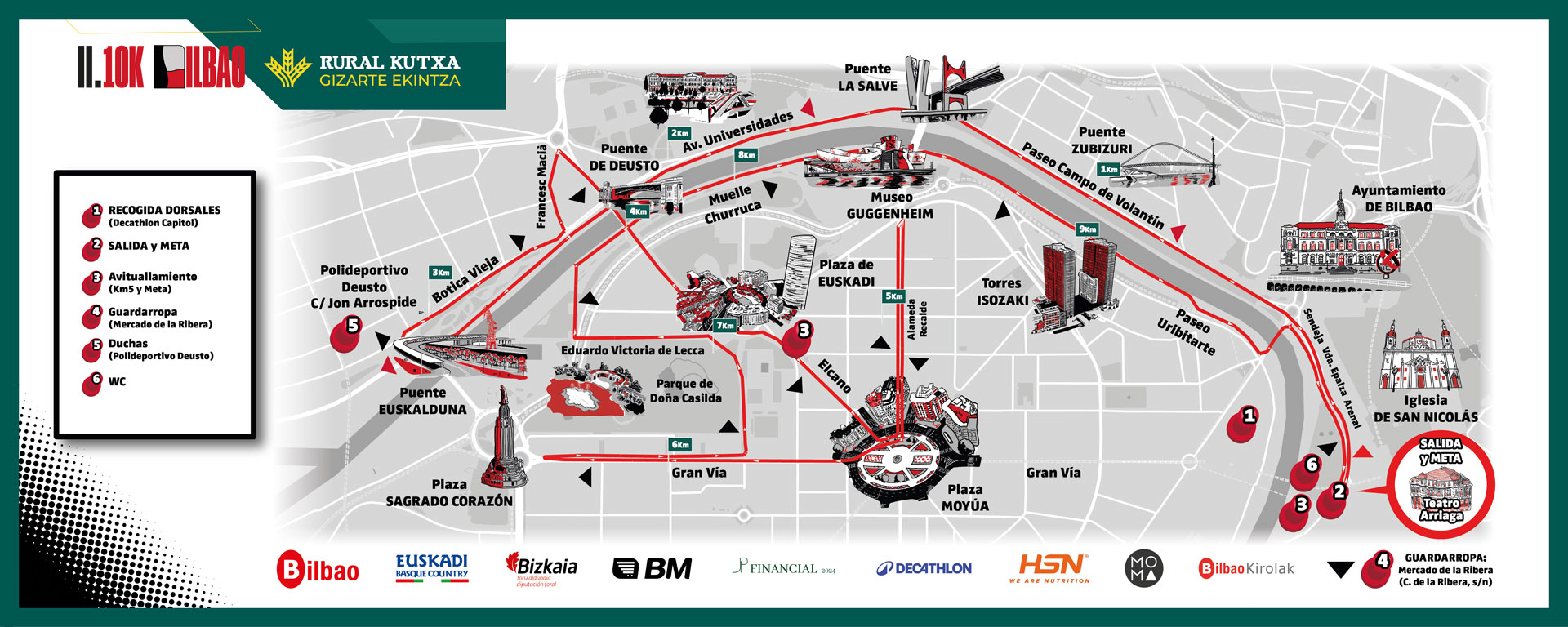 SALIDA: C/ ARENAL, C/ VIUDA EPALZA, C/ SENDEJA, ROTONDA AYUNTAMIENTO, PASEO CAMPO VOLANTIN, AV UNIVERSIDADES, C/ BOTICA VIEJA, C/ RIBERA DE DEUSTO, C/ BOTICA VIEJA, C/ FRANCESS MACIA, PUENTE DEUSTO, PLAZA EUSKADI, C/ ELCANO, PLAZA MOYUA, C/ ALAMEDA RECALDE, PLAZA MOYUA, C/ GRAN VIA, ALAMEDA CONDE DE ARTECHE, PARQUE DOÑA CASILDA, C/ EDUARDO VICTORIA DE LECEA, MUELLE EVARISTO CHURRUCA, PASARELA GUGGENHEIM, PASEO URIBITARTE, PUENTE AYUNTAMIENTO, C/ SENDEJA, C/ VUIDA EPALZA, META: C/ ARENAL